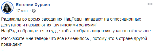 "Радикалы во время заседания НацРады нападают на оппозиционных депутатов и называют их "путинскими холуями". НацРада обращается в суд, чтобы отобрать лицензию у канала #newsone Расскажите мне теперь что все изменилось, потому что в стране другой президент" - пишет блогер Евгений Хурсин.