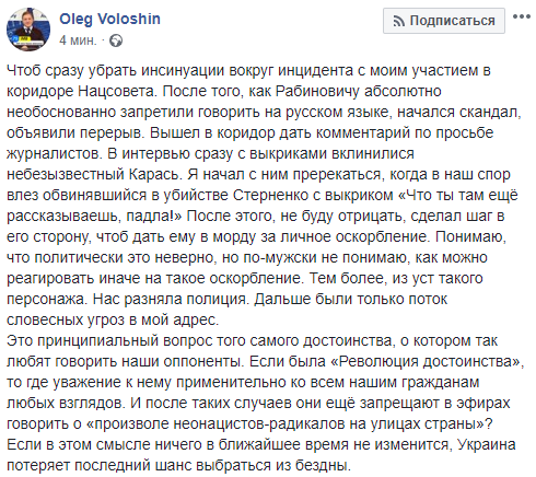 "Чтоб сразу убрать инсинуации вокруг инцидента с моим участием в коридоре Нацсовета. После того, как Рабиновичу абсолютно необоснованно запретили говорить на русском языке, начался скандал, объявили перерыв. Вышел в коридор дать комментарий по просьбе журналистов. В интервью сразу с выкриками вклинилися небезызвестный Карась. Я начал с ним пререкаться, когда в наш спор влез обвинявшийся в убийстве Стерненко с выкриком "Что ты там ещё рассказываешь, падла!" После этого, не буду отрицать, сделал шаг в его сторону, чтоб дать ему в морду за личное оскорбление. Понимаю, что политически это неверно, но по-мужски не понимаю, как можно реагировать иначе на такое оскорбление. Тем более, из уст такого персонажа. Нас разняла полиция. Дальше были только поток словесных угроз в мой адрес.