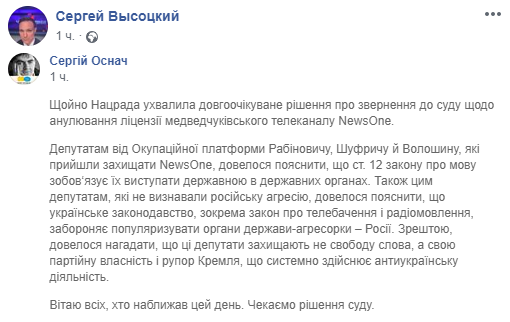 "Сегодня НацРада по вопросам ТВ и радио пролосовала за обращение в суд с требованием лишить NEWSONE лицензии.