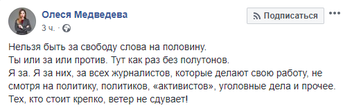 Я за. Я за них, за всех журналистов, которые делают свою работу, не смотря на политику, политиков, "активистов", уголовные дела и прочее. Тех, кто стоит крепко, ветер не сдувает!" - написала автор блога "Ясно-Понятно" Олеся Медведева.