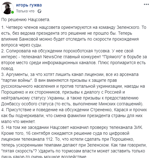 "1. Четверо членов нацсовета ориентируются на команду Зеленского. То есть, без ведома президента это решение не прошло бы. Теперь влияние Банковой можно будет отследить по скорости прохождения вопроса через суды.