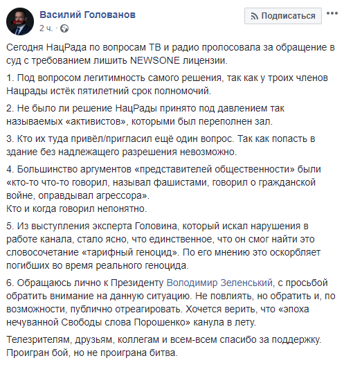 Проигран бой, но не проиграна битва" - написал генпродюсер NewsOne Василий Голованов.