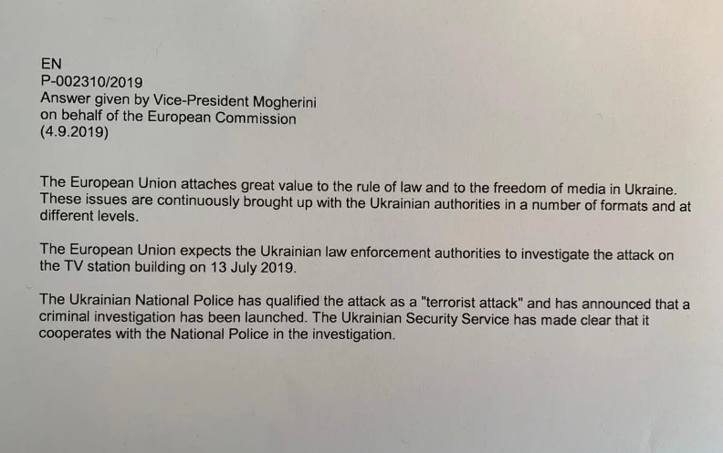 Могерини напомнила, что национальная полиция Украины квалифицировала нападение на СМИ как теракт и анонсировала начало уголовного расследования. А также, что Служба безопасности Украины дала понять, что сотрудничает с полицией в расследовании преступления.