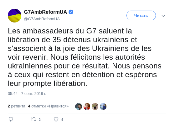 "Я приветствую решение России и Украины осуществить сегодня обмен 70 человек, удерживаемых одной или другой стороной, в число которых входят 24 украинских моряка, заключенных в России после морского инцидента в Керченском проливе 25 ноября 2018 года, об освобождении которых Франция не переставала просить и с семьями которых я встречался в Киеве 30 мая", - говорится в заявлении главы МИД Франции.