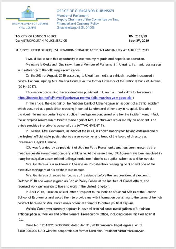 "Учитывая, что Гонтарева сейчас ломает в Лондоне комедию про "преследования", чтобы не отправиться по экстрадиции в Украину - публикует фейковые видео и фото про "ДТП с переломами", - решил обратиться в Полицию Лондона с запросом, был ли такой инцидент, и в чем его суть", - написал Дубинский.