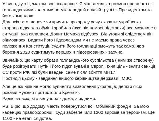 "Для всех, кто шепчет или кричит о "зраде", хочу сказать: украинская сторона отложила обмен и сделала (уже после моей отставки) все возможное в сложившейся ситуации. Допрос Цемаха состоялся. От сделки со следствием он отказался. Выдать его Нидерландам мы не имеем права из-за положения Конституции", - написал он.