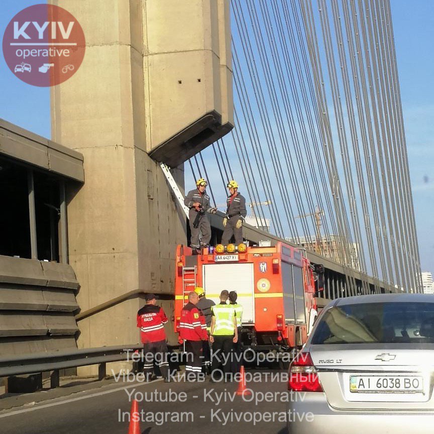 В Киеве мужчина залез на вершину Южного моста, где установлен флаг Украины. Доставать неизвестного оттуда приехали спасатели из Киевской службы спасения.