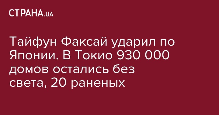 Сегодня ночью, 9 сентября, тайфун "Факсай" обрушился на Японию. Около 930 тысяч домов остались временно без электричества сообщила энергетическая компания TEPCO. Пострадали по меньшей мере 20 человек в соседней с Токио префектуре Тиба, где сильные дожди вызвали также оползень.