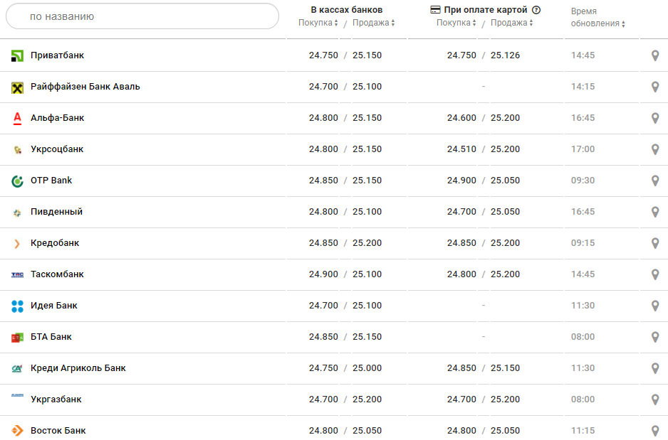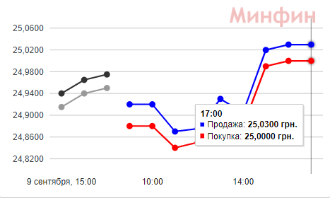 По состоянию на 17:00 котировки выросли на 5 копеек: 25 грн - покупка и 25,03 грн - продажа.