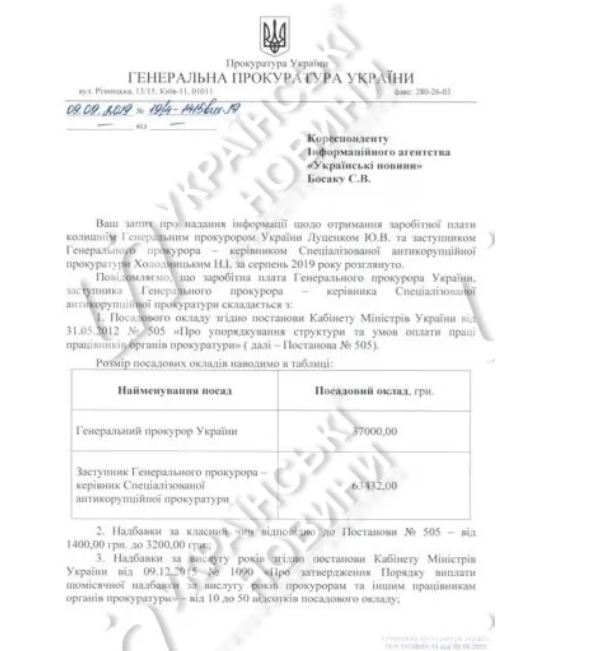 В документе уточняется, что зарплата Юрия Луценко за август составила 119 758 гривен. При этом оклад составил 37 тысяч гривен, остальное - надбавки, доплаты и премии.