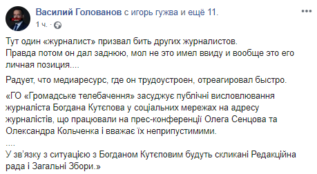 "Громадьске ТБ" осуждает любые проявления и призывы к насилию, как и любые высказывания, унижающие людей. Организация осуждает публичные высказывания журналиста Богдана Кутепова в социальных сетях в адрес журналистов, работавших на пресс-конференции Олега Сенцова и Александра Кольченко, и считает их недопустимыми.