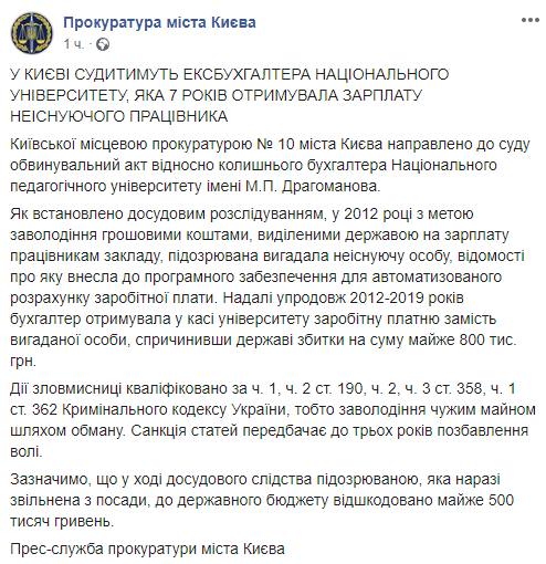 В сообщении говорится о том, что киевская прокуратура № 10 направила в суд обвинительный акт в отношении бывшего бухгалтера Национального педагогического университета имени М.П. Драгоманова.