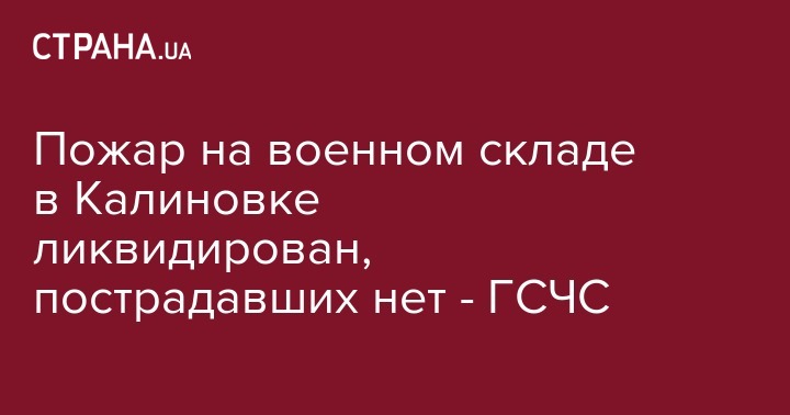Пожар на территории военного склада 48 арсенала Вооруженных сил Украины в Калиновском районе Винницкой области ликвидирован. Никто не погиб и не пострадал в результате инцидента. Об этом сообщила пресс-служба ГСЧС.