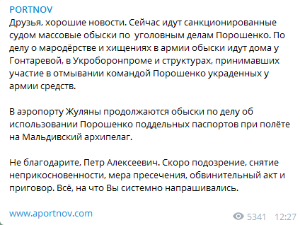 "Сейчас идут санкционированные судом массовые обыски по уголовным делам Порошенко. По делу о мародерстве и хищениях в армии обыски идут дома у Гонтаревой, в Укроборонпроме и структурах, принимавших участие в отмывании командой Порошенко украденных у армии средств", - написал Портнов.