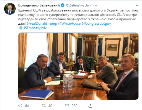 "Благодарен США за разблокирование военной помощи Украине, за постоянную поддержку нашего суверенитета и территориальной целостности. США вновь подтвердили свое стратегическое партнерство с Украиной. Вместе работаем дальше!", - написал Зеленский в своем микроблоге в Тtwitter.