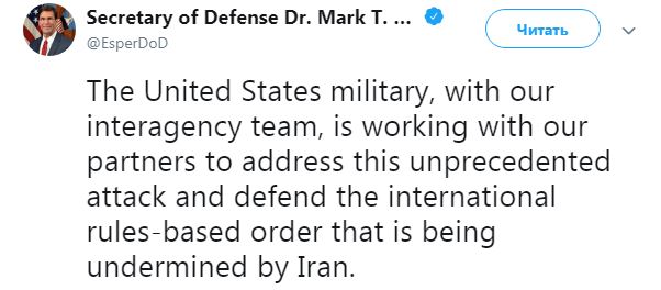 "Военные США, вместе с межведомственной группой, работают с нашими партнерами по поводу того, как реагировать на беспрецедентные атаки и защитить основанный на правилах международный порядок, который подрывает Иран", - написал он в Twitter.