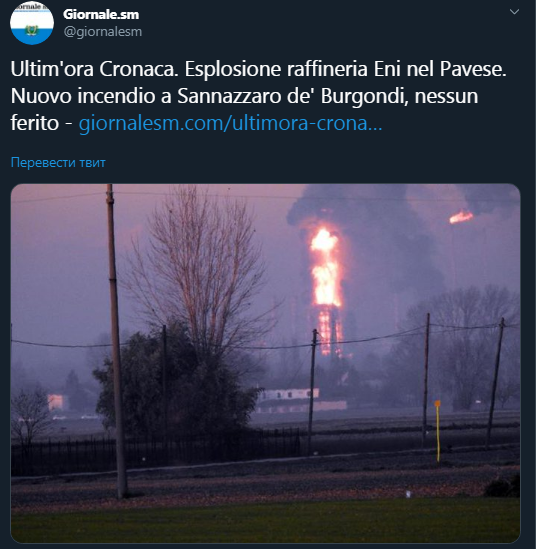 Сообщается, что инцидент произошел около 06:35 по местному времени (07:35 по киевскому) вблизи города Саннадзаро-де-Бургонди. Прогремевший взрыв привел к сильному пожару.