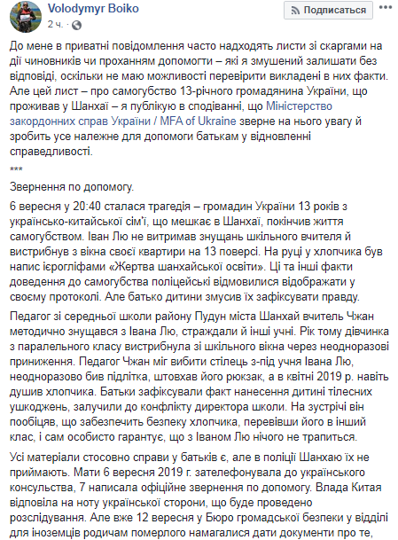 Он опубликовал письмо матери покончившего с собой подростка Елены Артеменко и призвал Министерство иностранных дел Украины обратить на инцидент внимание, так как китайские власти отказывают в справедливом расследовании инцидента.