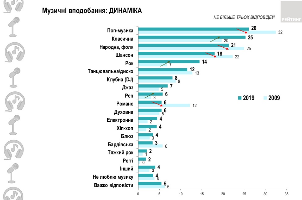 Социологи сравнили музыкальные предпочтения украинцев в 2019 и в 2009 году. Оказалось, что количество респондентов, слушающих поп-музыку, уменьшилось на 4% (с 32% до 26%). Также в два раза меньше этого года выбирали романсы (6% против 12%). Уменьшилось и любителей шансона (с 22% до 18%), а также ценителей народной музыки (с 25% до 21%).