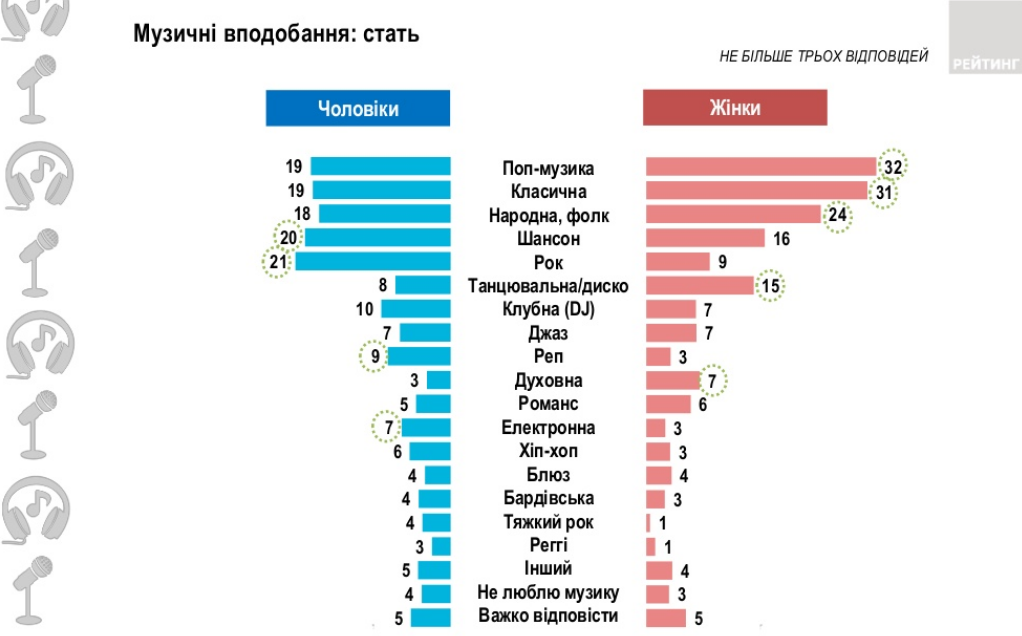 Также оказалось, что украинцы с 18 до 35 лет больше слушают поп-музыку, рок, диско, клубную, электронную музыку, а также рэп и хип-хоп. А представителям старших возрастных групп больше нравятся классическая и народная музыка, шансон, романсы и бардовская музыка.