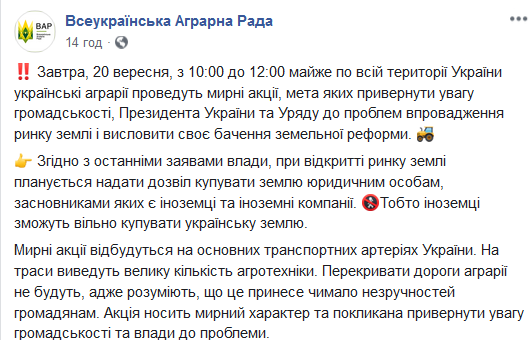 "20 сентября, с 10:00 до 12:00 почти по всей территории страны украинские аграрии проведут мирные акции, цель которых привлечь внимание общественности, президента Украины и правительства к проблемам внедрения рынка земли и высказать свое видение земельной реформы.