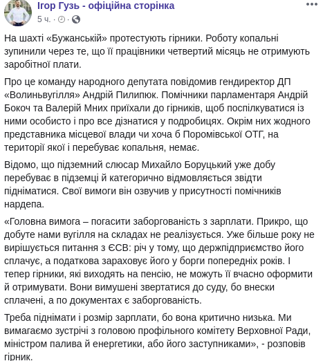 На Волыне шахтеры рудника Бужанский объявили забастовку, потому что четвертый месяц не получают заработную плату. Подземный слесарь Михаил Боруцкий уже сутки находится под землей и отказывается оттуда подниматься. Об этом на своей странице в Facebook сообщил народный депутат Игорь Гузь.