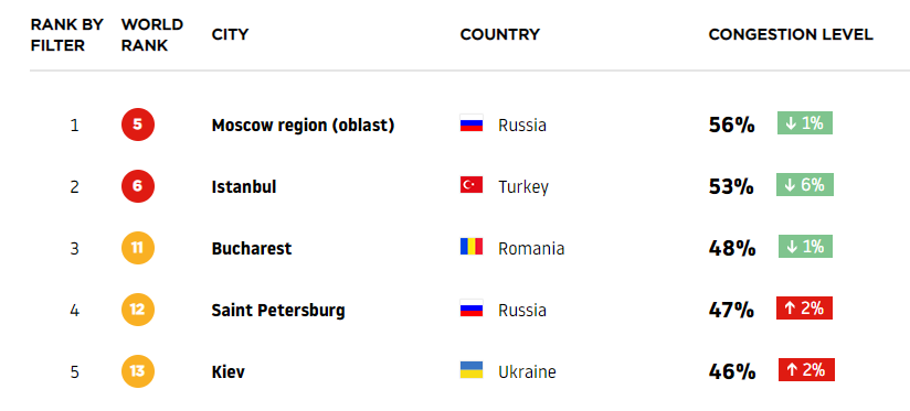 Первое место в рейтинге Traffic Index 2018 занял Мумбаи (Индия), в десятку также попали: Богота (Колумбия), Лима (Перу), Нью-Дели (Индия), Московская область (РФ), Стамбул (Турция), Джакарта (Индонезия), Бангкок (Таиланд), Мехико (Мексика).