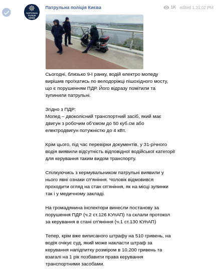 Водитель с признакам опьянения заехал на электромопеде на велодорожку пешеходно-велосипедного моста в Киеве. Об этом сообщает пресс-служба патрульной полиции столицы в своем ТГ-канале.