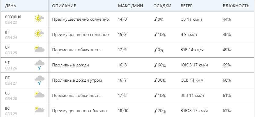 "Страна" собрала всю информацию о предстоящей погоде на неделю - с 23 по 29 сентября - по данным шести погодных ресурсов.