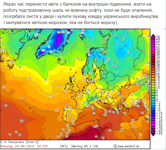 Синоптик Наталья Диденко сообщила, что в день осеннего равноденствия 23 сентября пришло время утепляться. Этой ночью в Полтавской и Черкасской областях ожидаются заморозки до 0-4 мороза. Ночная температура - в пределах 0...+7 градусов; в западных и южных областях +6...+13.