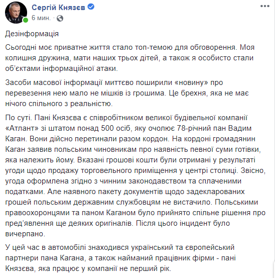 На своей странице в Facebook Сергей Князев указал, что они с бывшей женой стали объектом информационной атаки. Хотя факт перевозки крупной суммы через кордон признал. Но заявляет, что они принадлежали не его супруге.