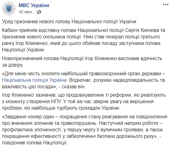 "Задача номер один - улучшение состояния реагирования на сообщения о совершении преступлений и правонарушений. Следующее направление работы - профилактика преступности, в первую очередь ее уличных проявлений, а также повышение эффективности в обеспечении безопасности дорожного движения", - цитирует Клименко Facebook МВД.
