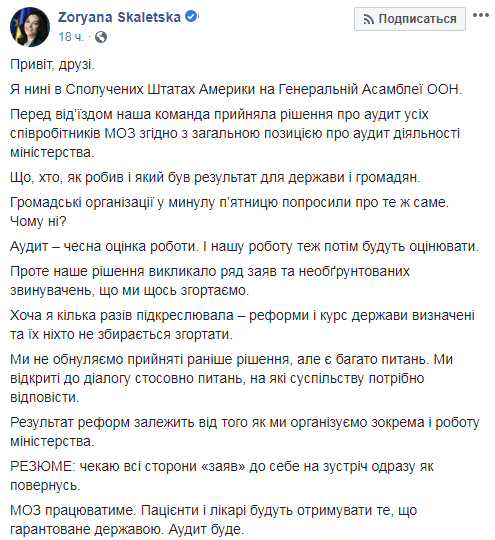 В целом об аудите отрасли также говорится на фб-странице министра здравоохранения Зоряны Скалецкой. Также она подчеркнула, что не собирается сворачивать реформы в сфере здравоохранения.
