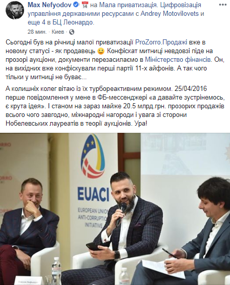 "Сегодня был на годовщине малой приватизации ProZorro уже в новом статусе - как продавец. Конфискат таможни вскоре пойдет на прозрачные аукционы, документы перешлем в Министерство финансов", - поделился планами главный таможенник страны.