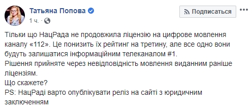 13:37 Соцсети регируют на решение Нацсовета. Бывший заместитель министра информационной политики Татьяна Попова пишет: "Только что Нацсовет не продлил лицензию на цифровое вещание канала 112. Это снизит их рейтинг на треть, но все равно они будут оставаться информационным телеканалом # 1.