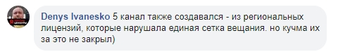 Секретарь НСЖУ Денис Иванеско в комментарии под этим постом отметил: "5 канал также создавался - из региональных лицензий, которые нарушала единая сетка вещания. Но Кучма их за это не закрыл".