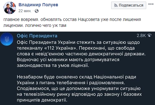 "Офис Президента Украины следит за ситуацией по телеканалу "112 Украина". Убеждены, что свобода слова является неотъемлемой частью демократического государства. В то же время все вещатели должны придерживаться законодательства и условий лицензии.