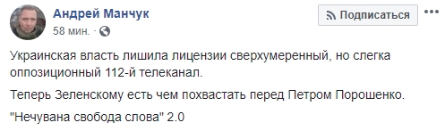 Журналист Андрей Манчук: "Украинская власть лишила лицензии сверхумеренный, но слегка оппозиционный 112-й телеканал.