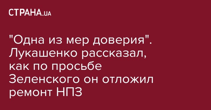 Президент Украины Владимир Зеленский просил президента Беларуси Александра Лукашенко перенести плановый ремонт на Мозырском нефтеперерабатывающем заводе (НПЗ). Об этом со ссылкой на слова Лукашенко пишет "Интерфакс".