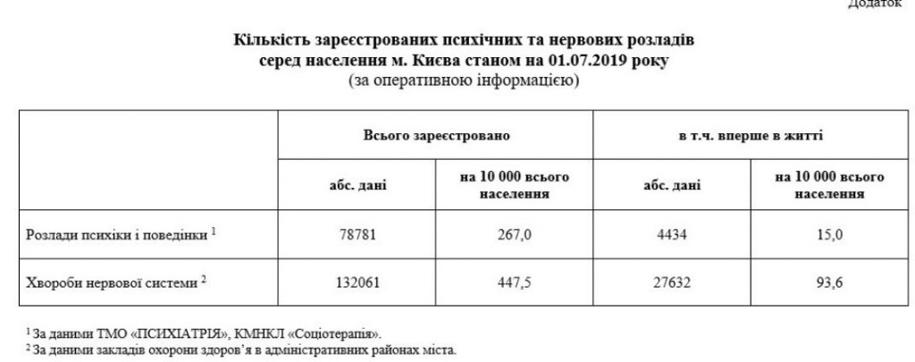 В Киеве стали существенно реже фиксировать случаи расстройства психики и поведения. В текущем году уже выявлено 78 781 таких случаев по сравнению с 99 087 в 2010-м. Также сократилось число выявлений болезней нервной системы, до 132 061 по состоянию на июль 2019 года.
