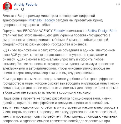 "Дія" - это приложение и сайт, которые объединят в едином электронном окне все услуги, которые предоставляет государство гражданам и бизнесу. "Дія" сможет максимально упростить и ускорить любое взаимодействие человека с государством, сделав максимум процессов электронными и автоматическими, чтобы чиновник лично вообще не влиял на срок получения справки или выдачу разрешения", - написал Федорив на своей странице в Facebook.