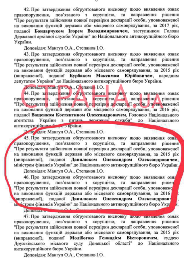 По данным "Страны", был согласован проект решения об утверждении обоснованного заключения касательно выявления признаков правонарушения, связанного с коррупцией, и направлении решения "О результатах осуществления полной проверки декларации лица, уполномоченного на выполнение функций государства или местного самоуправления, за 2015 год (исправленной), поданной Данилюком Александром Александровичем, министром финансов Украины" в Национальное антикоррупционное бюро.