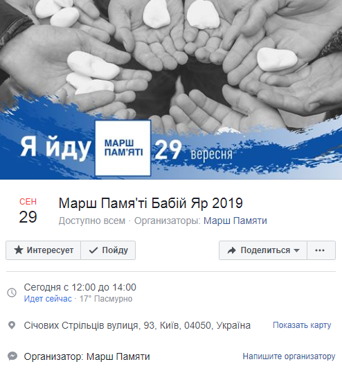В воскресенье, 29 сентября в Киеве в честь погибших в Бабьем Яру проходит ежегодный Марш памяти. Об этом сказано на странице акции в Facebook.
