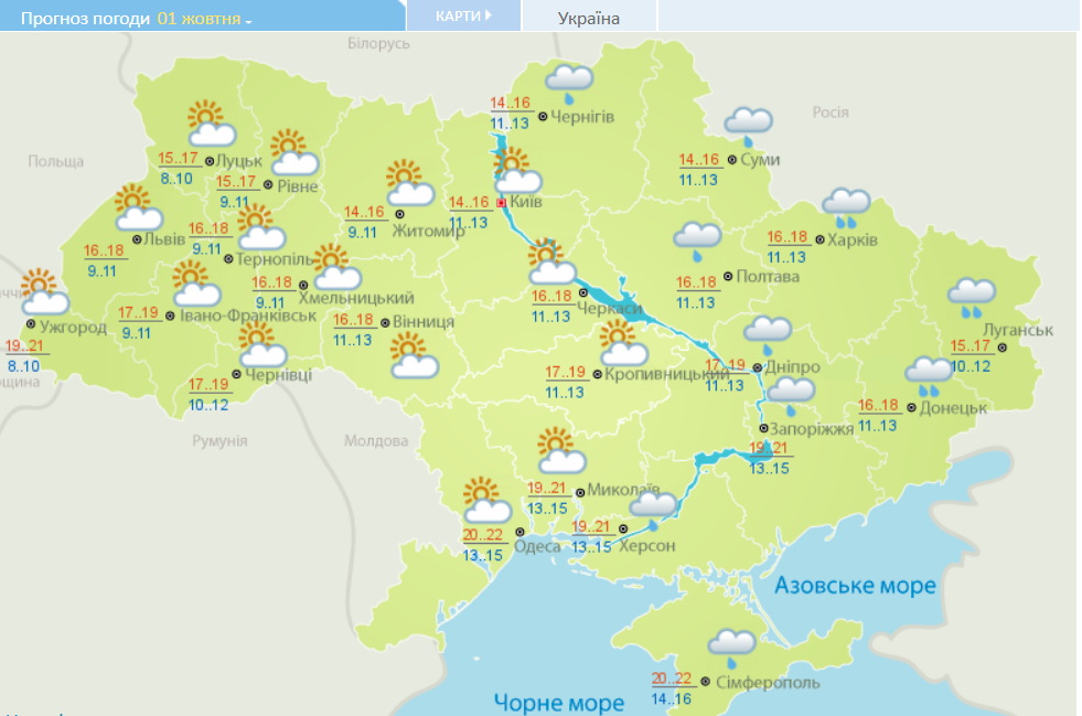 1 октября небо над большинством регионов очистится от дождевых туч. Осадки возможны лишь на северо-востоке, в Днепре, Запорожье и Херсоне. Средняя дневная температура составит +16...+18 градусов. В Причерноморье столбики термометров преодолеют отметку +20 градусов. Ночью похолодает до +9...+12.