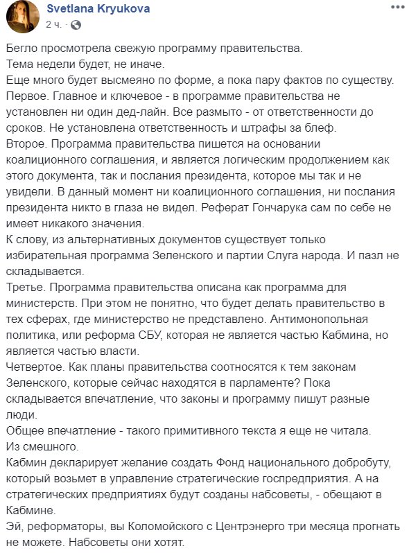 Второе. Программа правительства пишется на основании коалиционного соглашения, и является логическим продолжением как этого документа, так и послания президента, которое мы так и не увидели. В данный момент ни коалиционного соглашения, ни послания президента никто в глаза не видел. Реферат Гончарука сам по себе не имеет никакого значения.