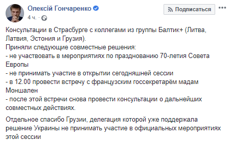 "Отдельное спасибо Грузии, делегация которой уже поддержала решение Украины не принимать участие в официальных мероприятиях этой сессии", - написал Гончаренко.