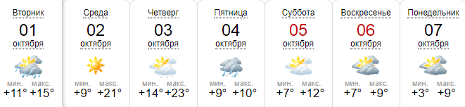 Похожую картину рисует и Gismeteo. 1 октября, сегодня, дождь и до +15. Во вторник потеплеет до +21, солнечно. В среду +22, возможна гроза. Грозу обещают и в пятницу, 4 октября, а также похолодание до +11. На выходных в Киеве +11...+12, вероятны осадки.