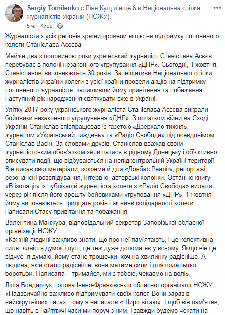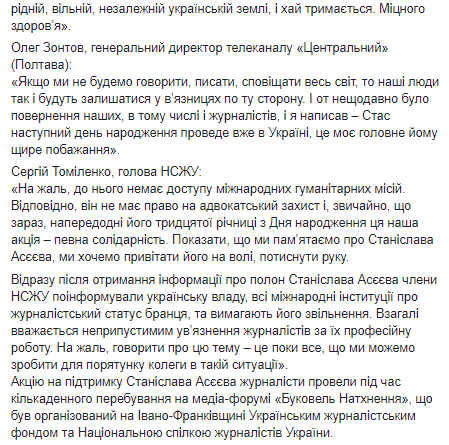 "Накануне его тридцатой годовщины со дня рождения эта наша акция - определенная солидарность. Показать, что мы помним о Станиславе Асееве, мы хотим поздравить его на свободе, пожать руку", - добавил глава НСЖУ.