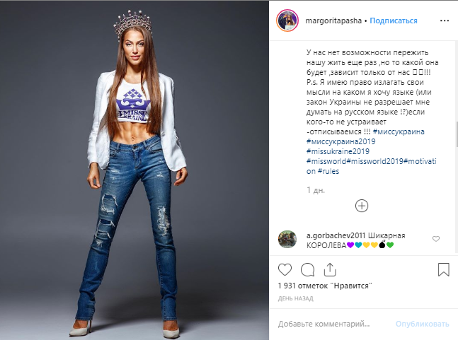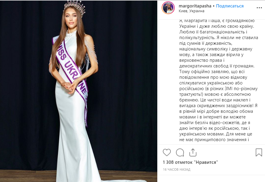 Вскоре после скандального поста "Мисс Украина 2019" опубликовала еще один. В этот раз на украинском языке. "Я, Маргарита Паша, являюсь гражданкой Украины и очень люблю свою страну. Люблю ее многонациональность и поликультурность. Я никогда не ставила под сомнение ее государственность, национальную символику и государственный язык, а также всегда верила в верховенство права и демократических свобод ее граждан" - написала девушка.