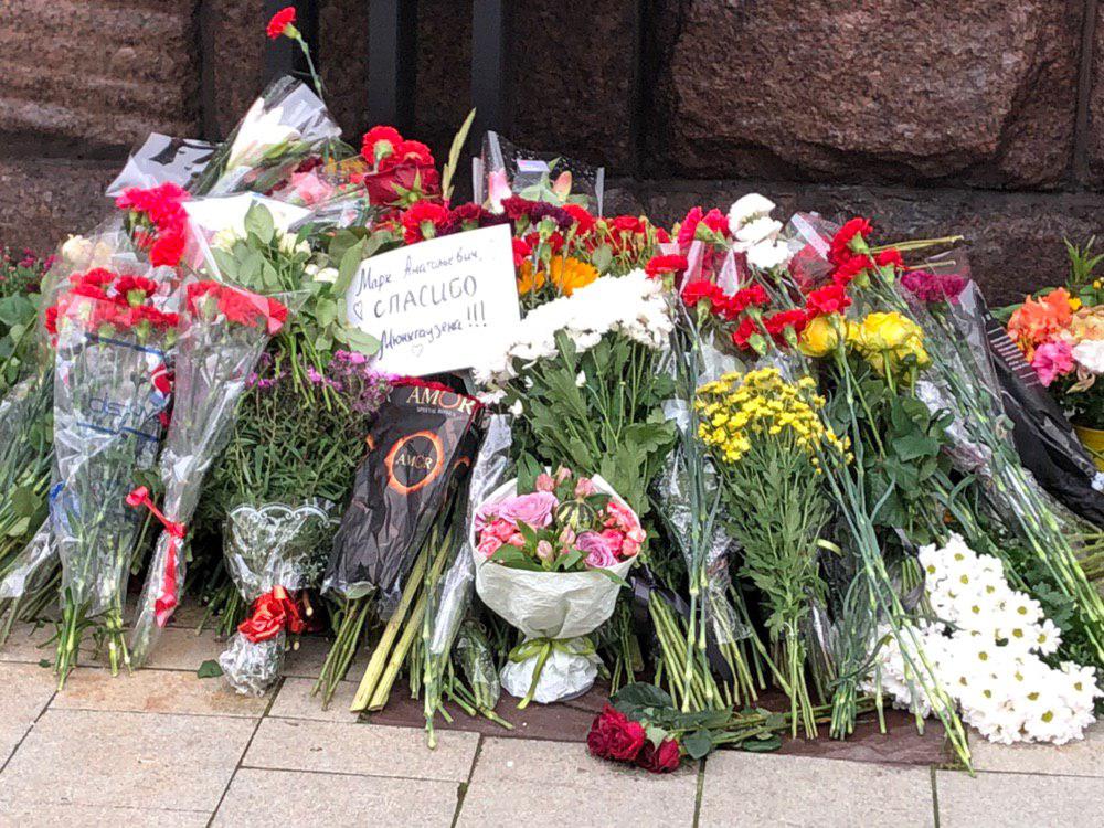 На улице возле афиши цветы с благодарностью Марку Анатольевичу. Фото: Страна.ua